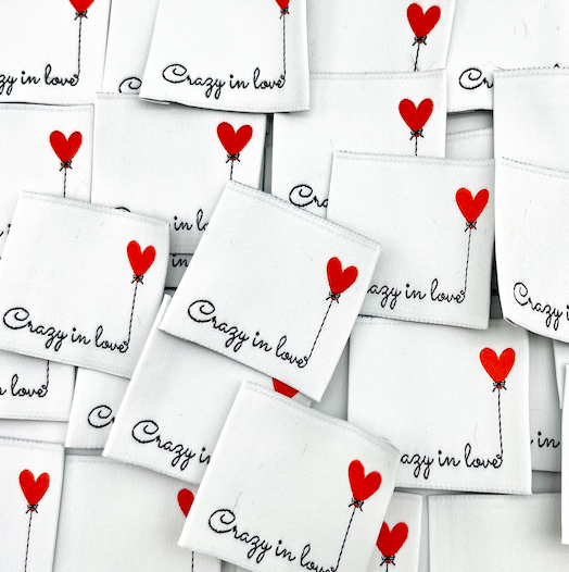 Étiquettes tissées de couleur noir avec l'inscription "Crazy in love" à coudre sur les vêtements. Elles ne s’effilochent pas et apporteront une touche finale pour terminer les créations ou personnaliser un vêtement. Elles peuvent également cacher un accroc ou une tache!